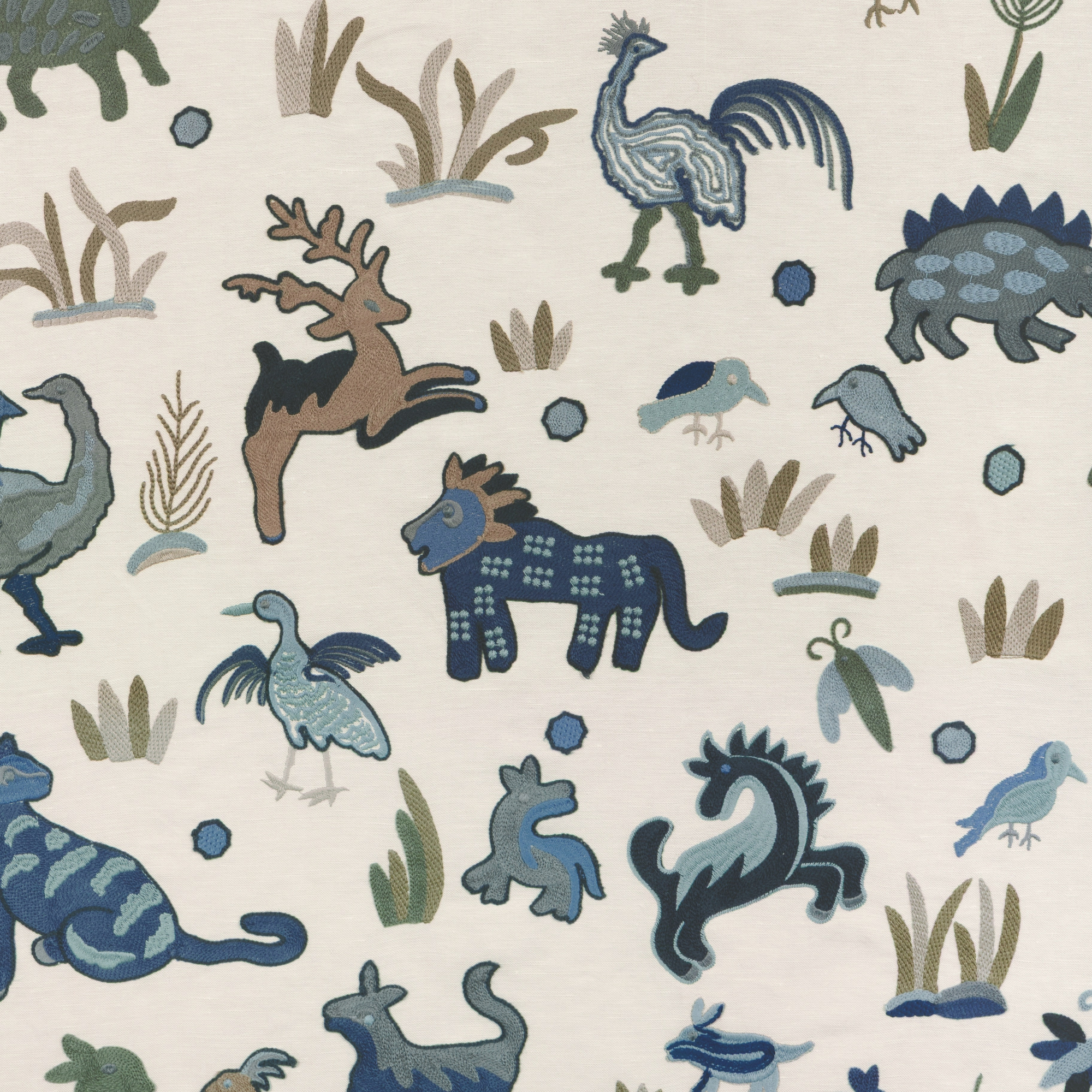 The joyful menagerie of animals and plants featured here references creatures both real and imagined encountered by the Pakistani artisan who made the original felted and embroidered wool rug. Known as Namda, these felted rugs made in the Kashmir region of northern India, a region known for its rich textile heritage, served as saddle blankets or raincapes. The maker of the original Museum textile wanted to describe the multitude of two and four-legged creatures one might encounter on an adventure where a saddle or raincape might be needed. Dwellers is inspired by a textile in the collections of the Museum of International Folk Art in Santa Fe, New Mexico.