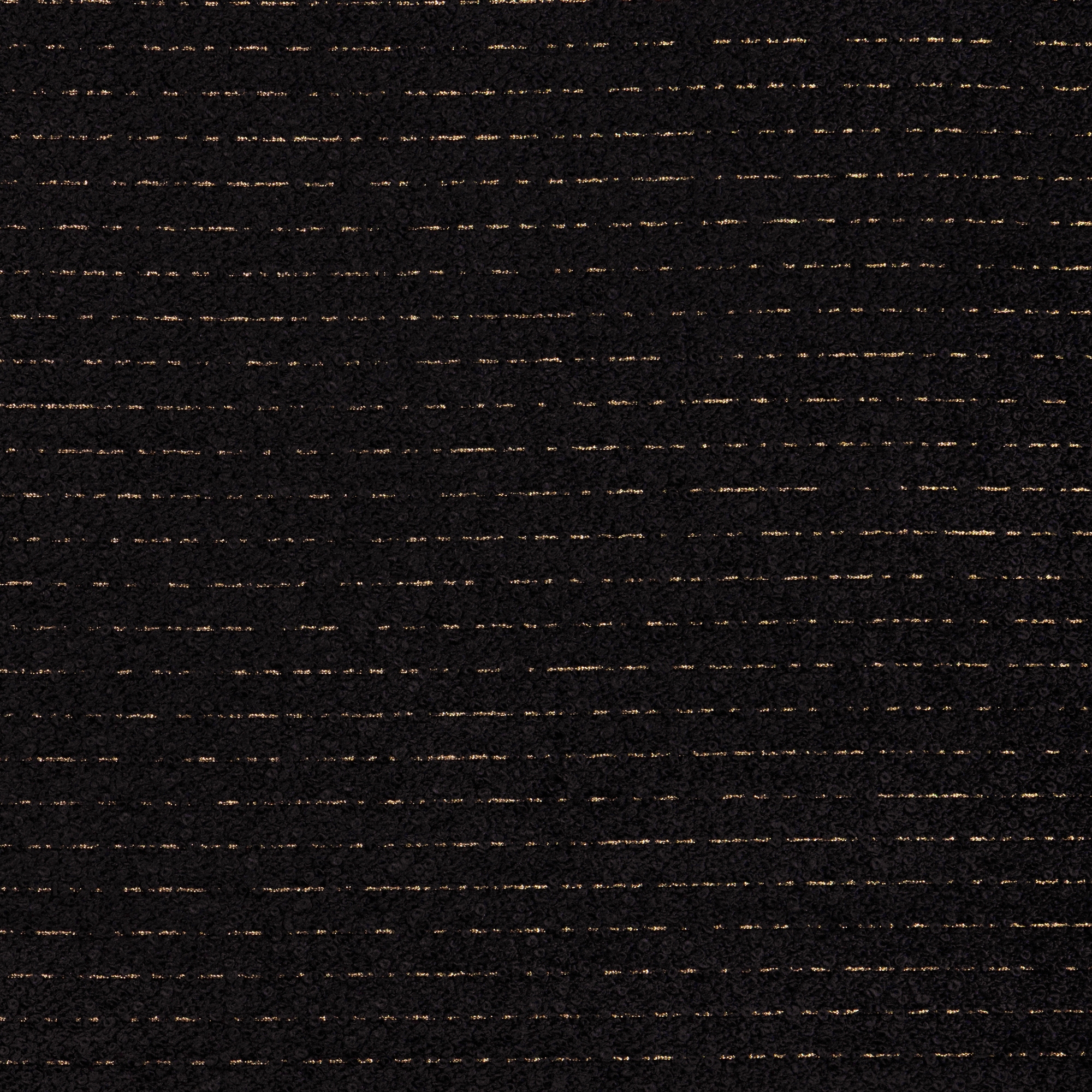 Wide bands of thick boucle are punctuated at regular intervals by thin horizontals of metallic yarn in this upholstery-weight foundation. The characteristic loopy tufts of the boucle serve to both hide and reveal soft shimmer. The whole can be rotated to create vertical striping on furniture as may be desired.