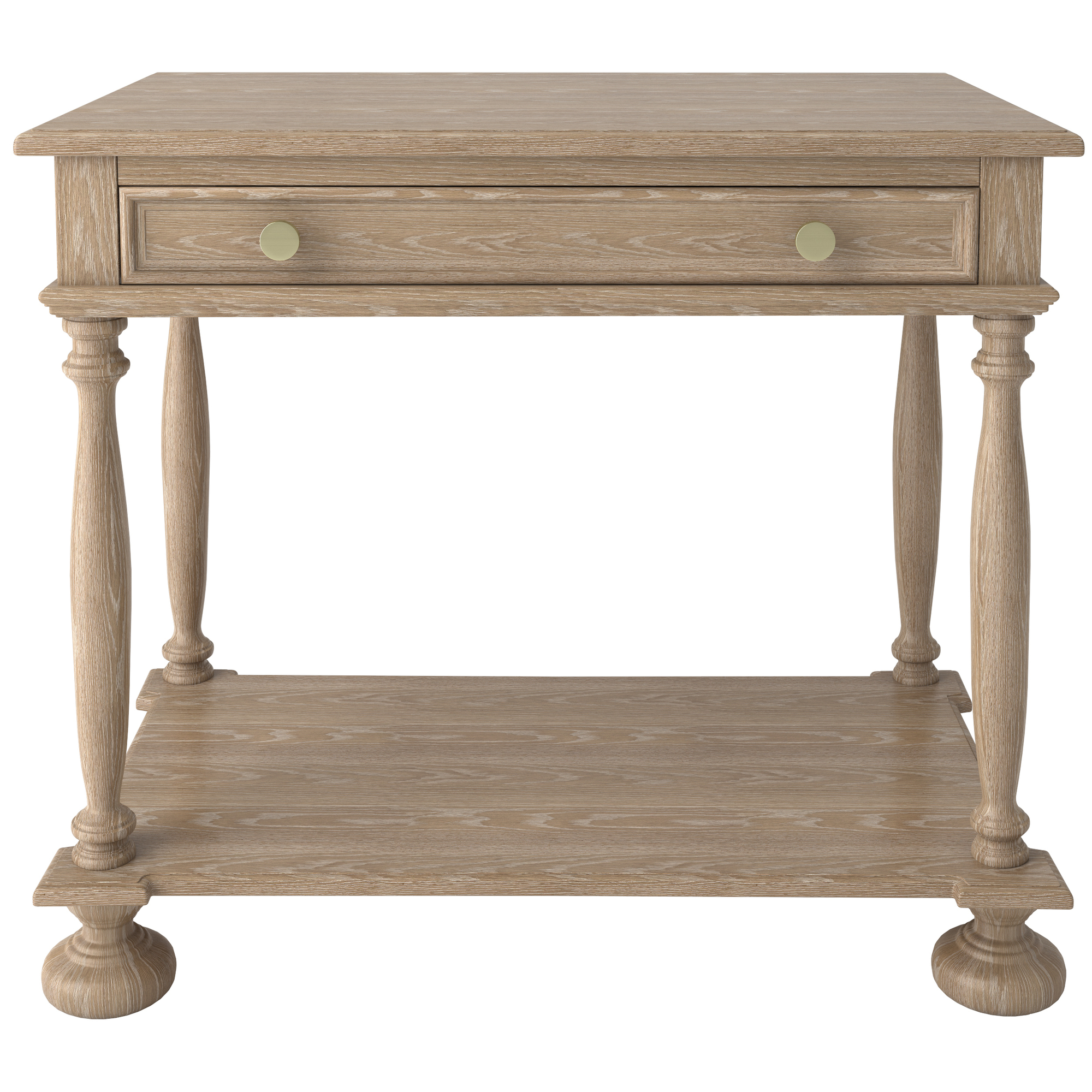 A solid oak nightstand with one drawer and one shelf, featuring a custom cerused blonde wood finish and solid brass drawer knobs. Made in the USA.