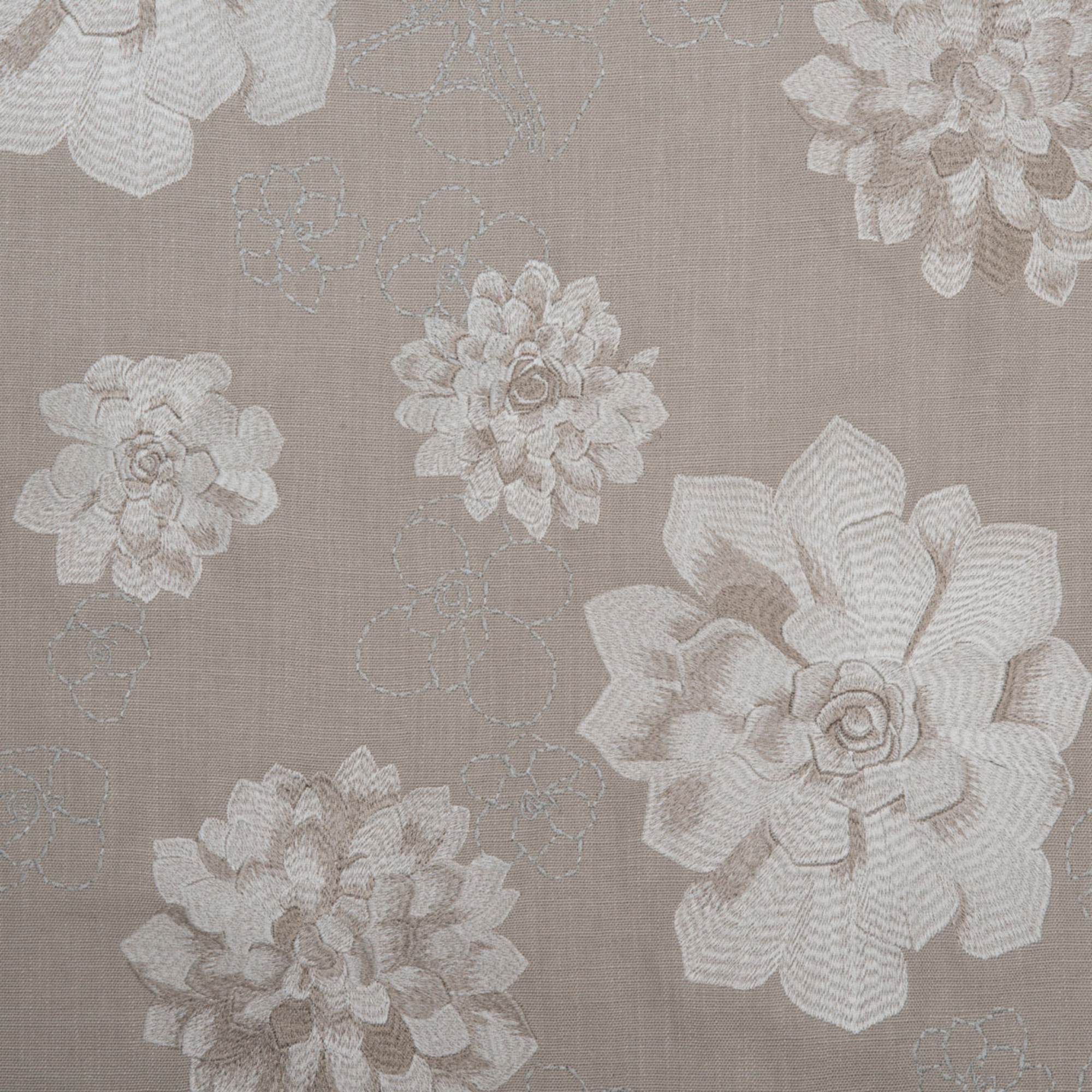 A statement fabric made for the collection, Desert Bloom depicts embroidered botanicals on a woven ground creating the look of sketching and movement. Smaller outlined blooms mirror its detailed counterparts.