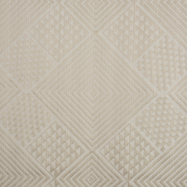 An ethnic design of diamond shapes is made city-sophisticated with the help of a sumptuous brocatelle weave. This unique construction adds height and dimension to the patterning, seeming to lift it up off the background. A strie warp is used to add even m