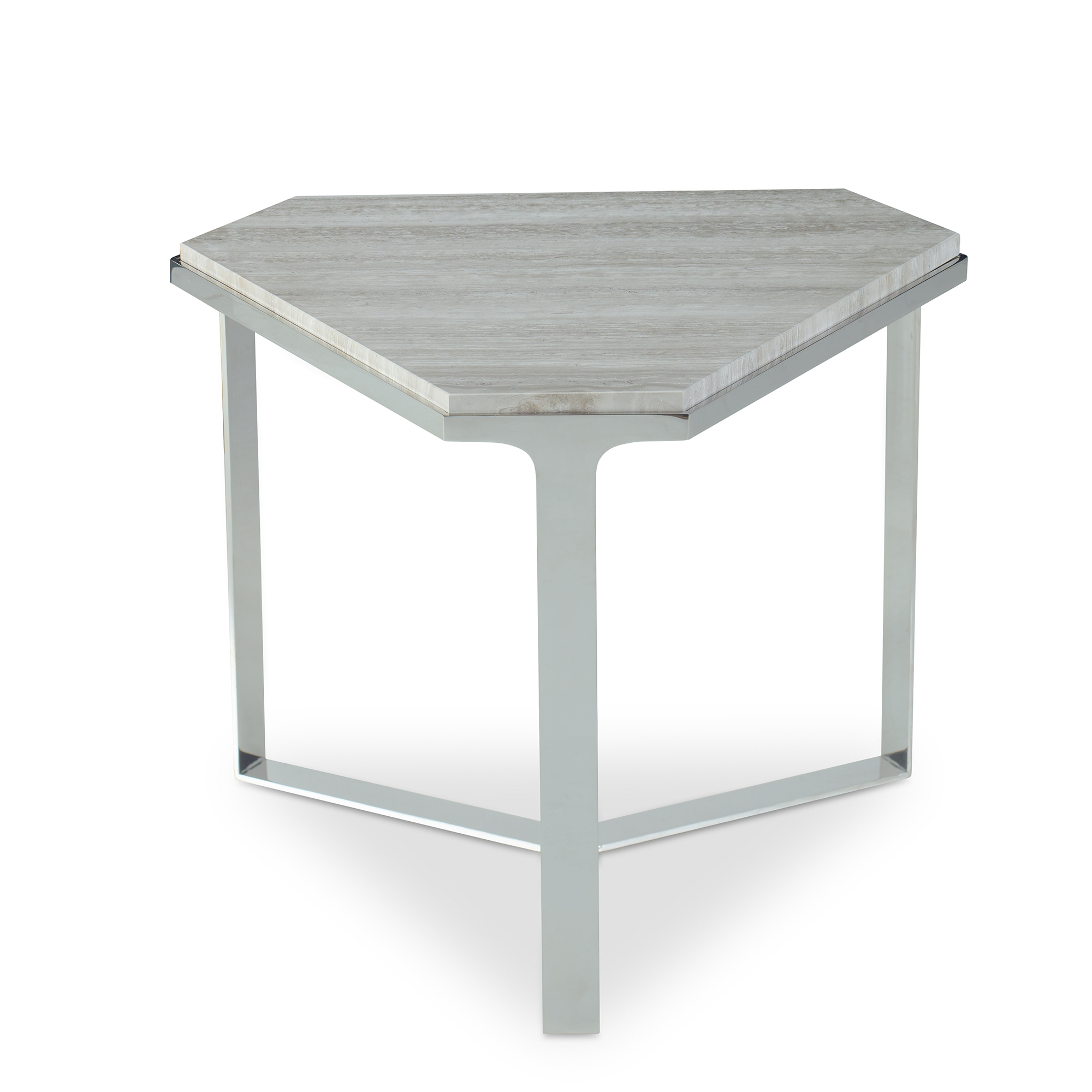 Triangular shaped table in a high luster chrome finish with a honed Ancient White stone top. Please note the Forma Tables with a glass top are .25" shorter in height than the tables with stone tops.