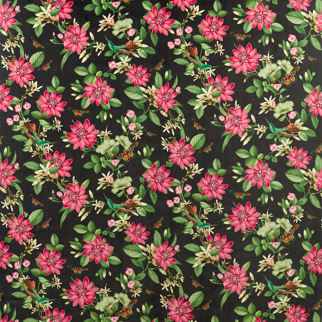 A symbol of inner wisdom and the sanctity of daily life, the Pink Lotus is considered a sacred flower in the tropics of Asia. Typically found in marshy swamps, it produces gigantic fragrant blossoms and leaves, a haven for flying insects such as bejewelled dragonflies. The delicate balance of daily life is celebrated in this bold and beautiful pattern, that's printed on both linen and velvet.