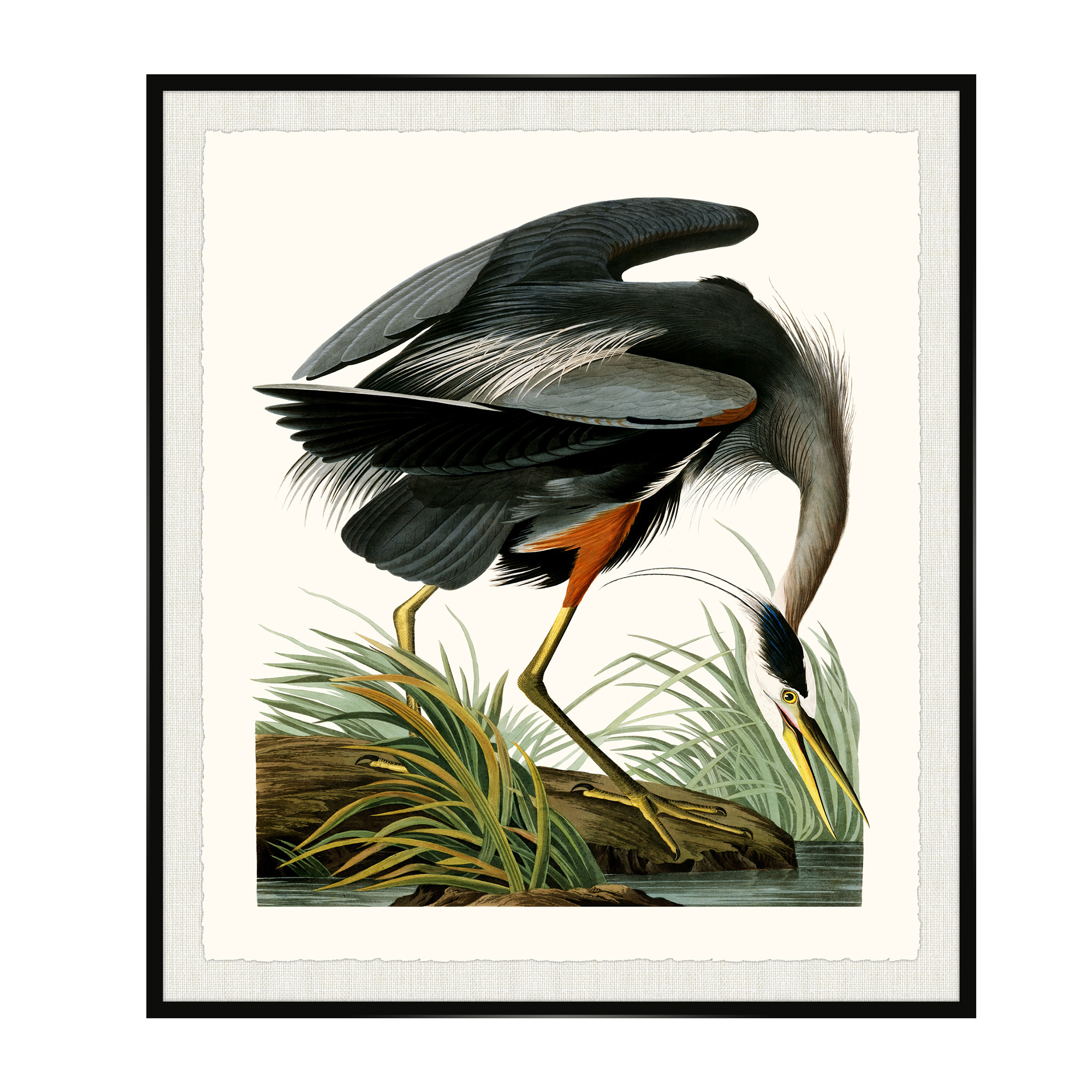 A Great Blue Heron floating on Kravet Smart linen 34960-101, on Archival paper with a hand deckled edge. Featuring a thin black wood frame.