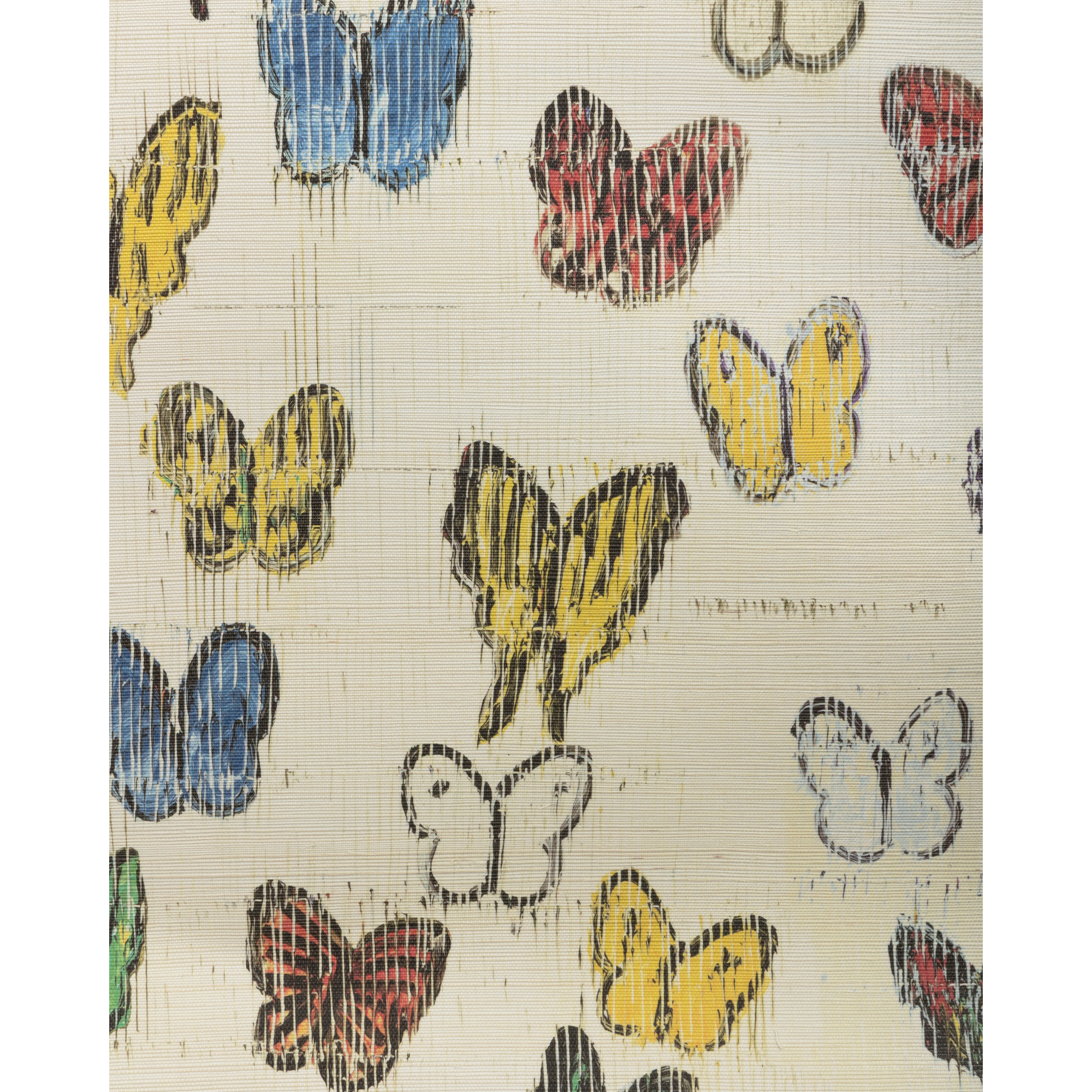 Inspired by the renowned artwork of Hunt Slonem, "Flutter" is a decorative print featuring multicolor butterflies on an ivory ground. This painterly design is available as both a printed linen fabric and printed sisal wallcovering.