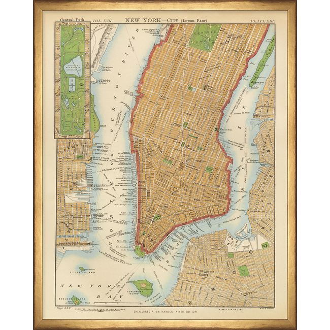 Print of the lower part of Manhattan, south of Central Park. From the Encyclopedia Britannica published in 1892. Printed on high quality paper and framed using renowned mouldings. Available in five sizes. Part of the CuratedKravet quick ship wall art program, shipping in 5 days or less.